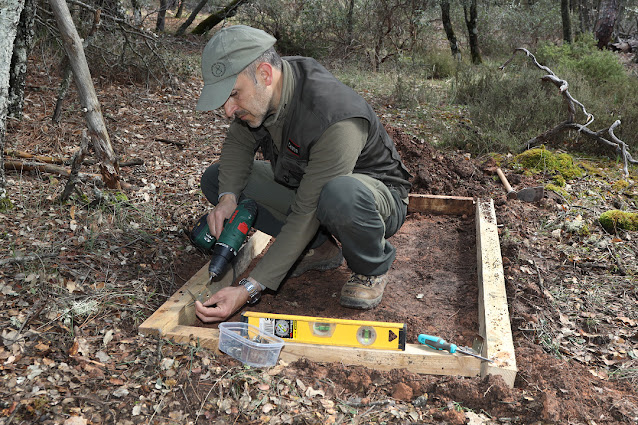 El método que te explico mediante fotos es perfectamente aplicable a un bebedero montado sobre una estructura para ganar altura y poder fotografiar cómodamente sentado en una silla desde el interior de un hide. Yo suelo hacerlos en el suelo porque priorizo fotografiar rapaces y me suele ir bien con los hides bajos (tumbihides) a ras de suelo cuyo forma y tamaño son muy discretos aunque fatales para la cervicales.